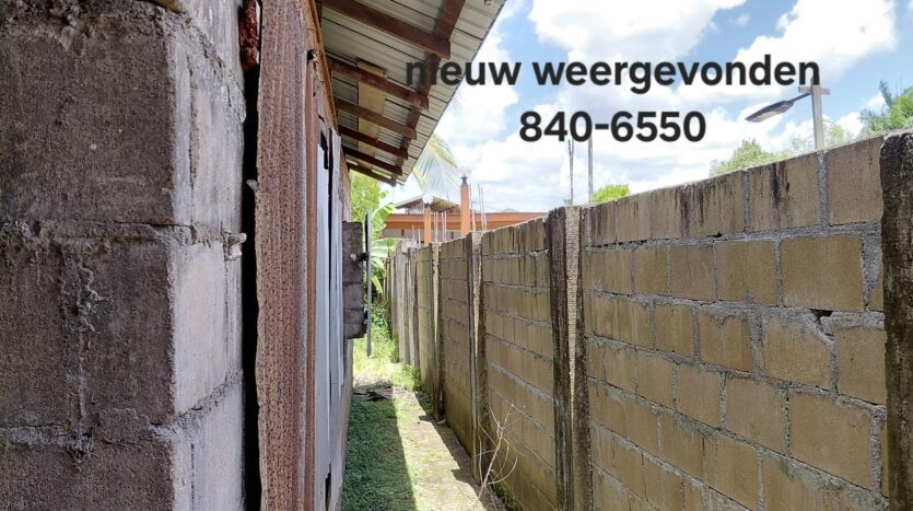 Een top locatie gelegen aan de Nieuw weergevondenweg, de ligging is commercieel zowel residentieel geschikt. Te koop aangeboden 1x in aanbouw zijnde betonnen woning. Perceel oppervlakte 1000m2, bouwoppervlakte is 100m2. 2 slaapkamer indeling. Koopsom Euro52,500.- / contant betalen zowel giraal is toegestaan. Bellen of whatsapp op mob 597-8406550