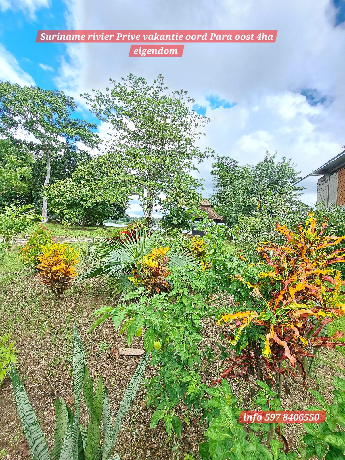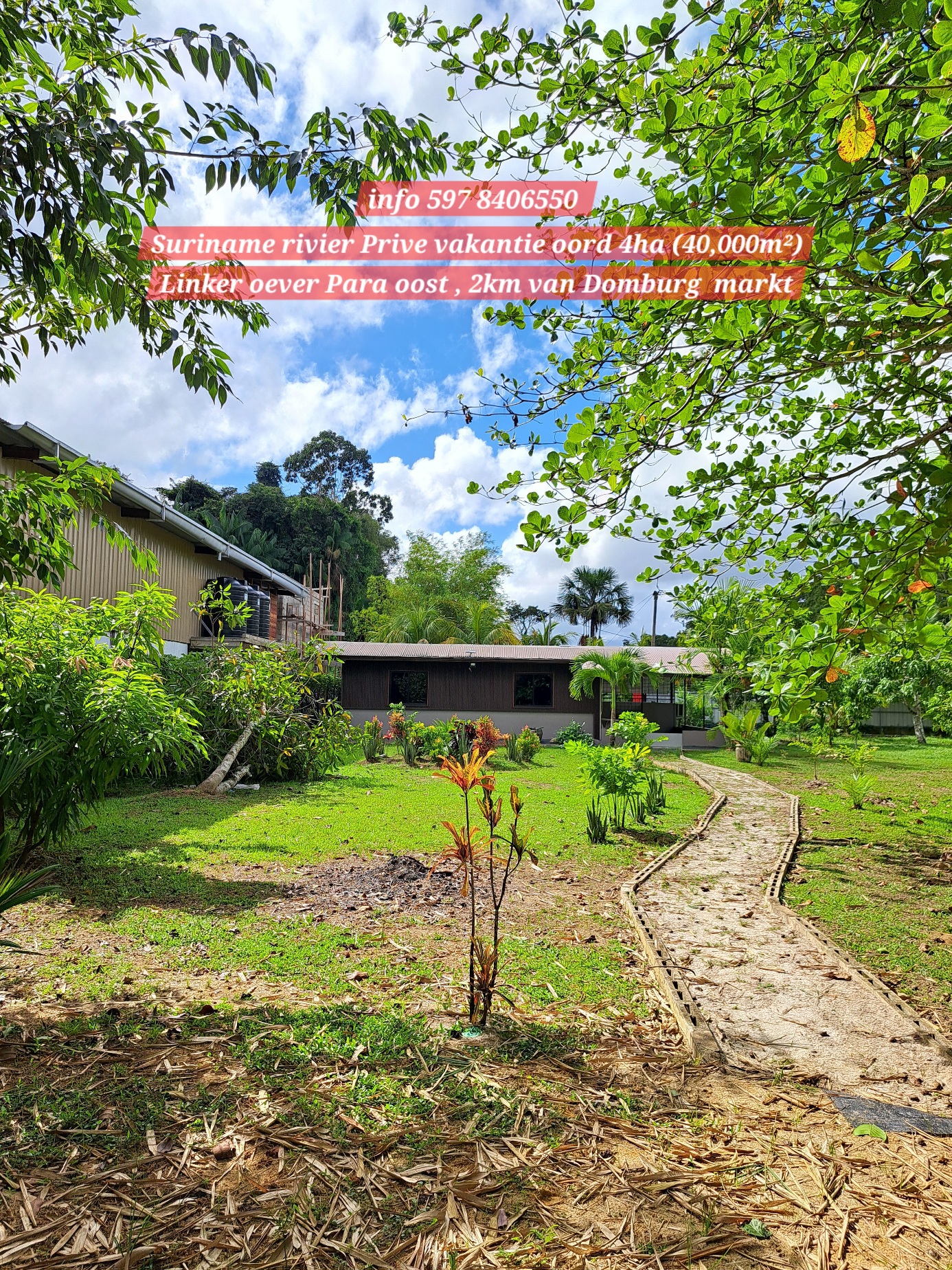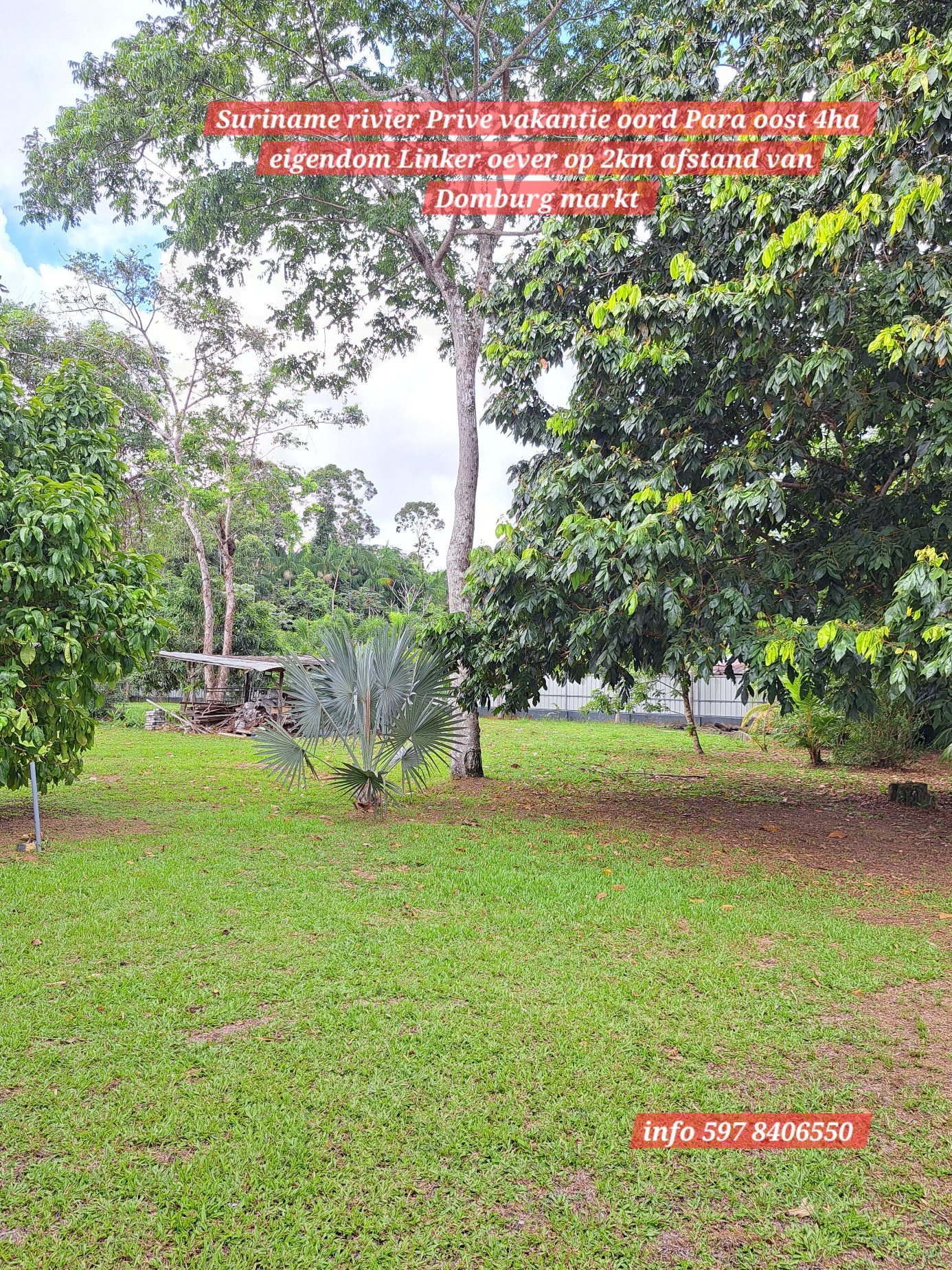 Ontzettend mooie vakantie oord, makelijk te bereiken via de Sir winston Churchillweg en slechts op 2km afstand verwijder van Domburg markt. 4Ha eigendoms perceel, met een front breedte van 50 meter langs de Suriname rivier. Op het terein langs de rivier is reeds een duurzame betonnen-fundering aangelegd om de grond langs de oever te beschermen tegen water -en winderosie.