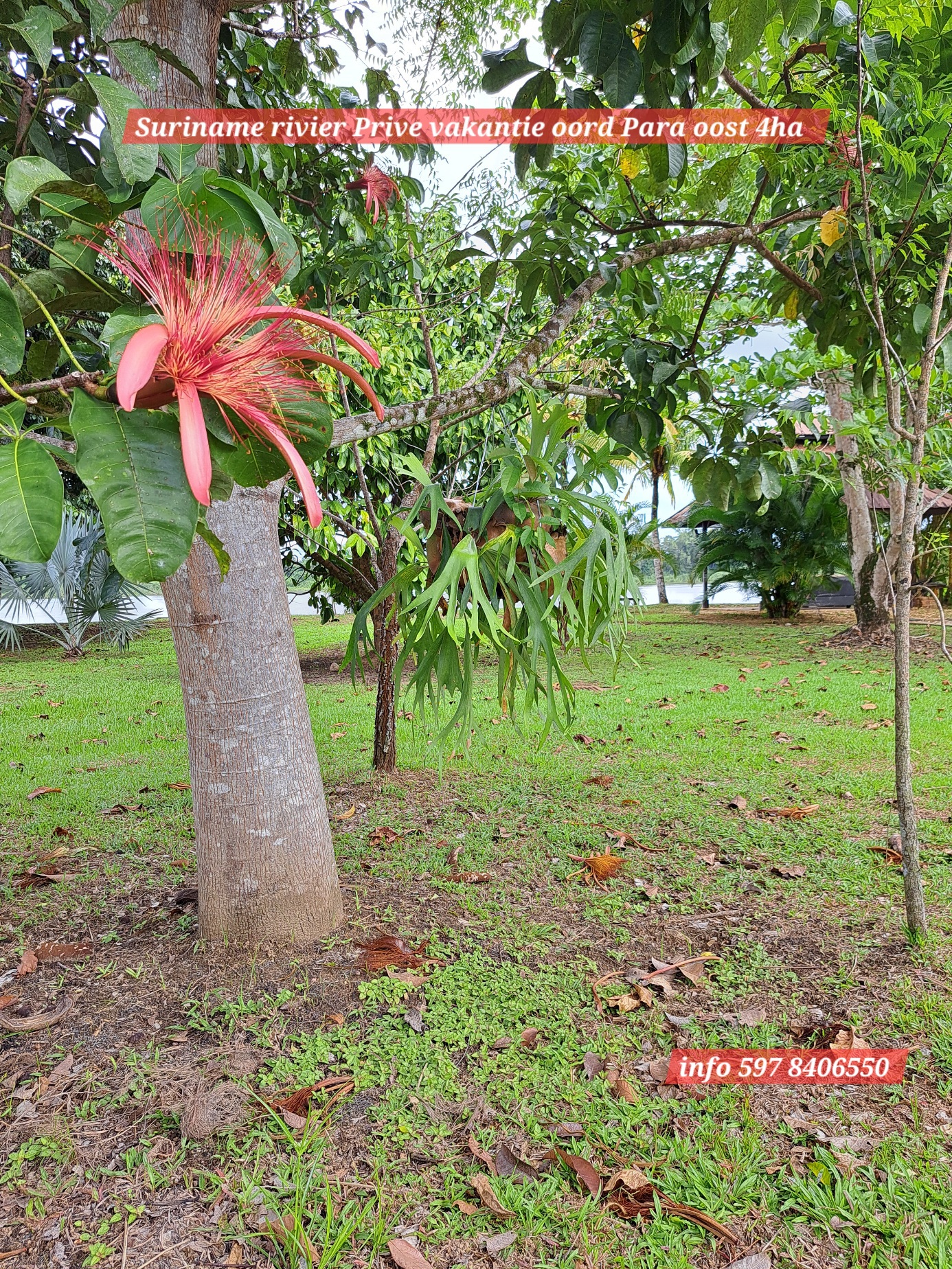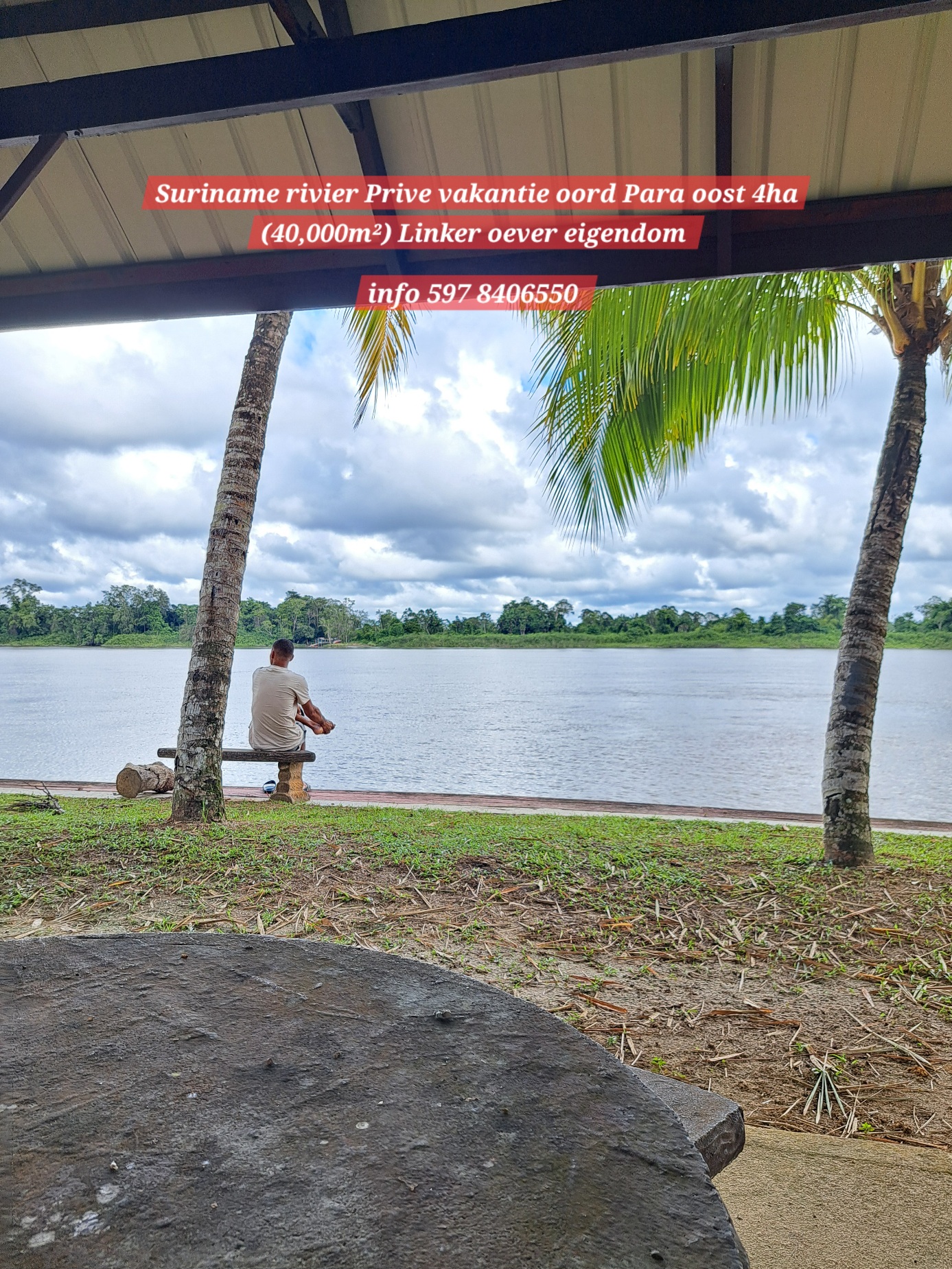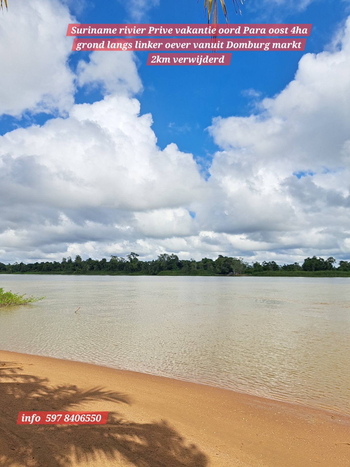 Ontzettend mooie vakantie oord, makelijk te bereiken via de Sir winston Churchillweg en slechts op 2km afstand verwijder van Domburg markt. 4Ha eigendoms perceel, met een front breedte van 50 meter langs de Suriname rivier. Op het terein langs de rivier is reeds een duurzame betonnen-fundering aangelegd om de grond langs de oever te beschermen tegen water -en winderosie.