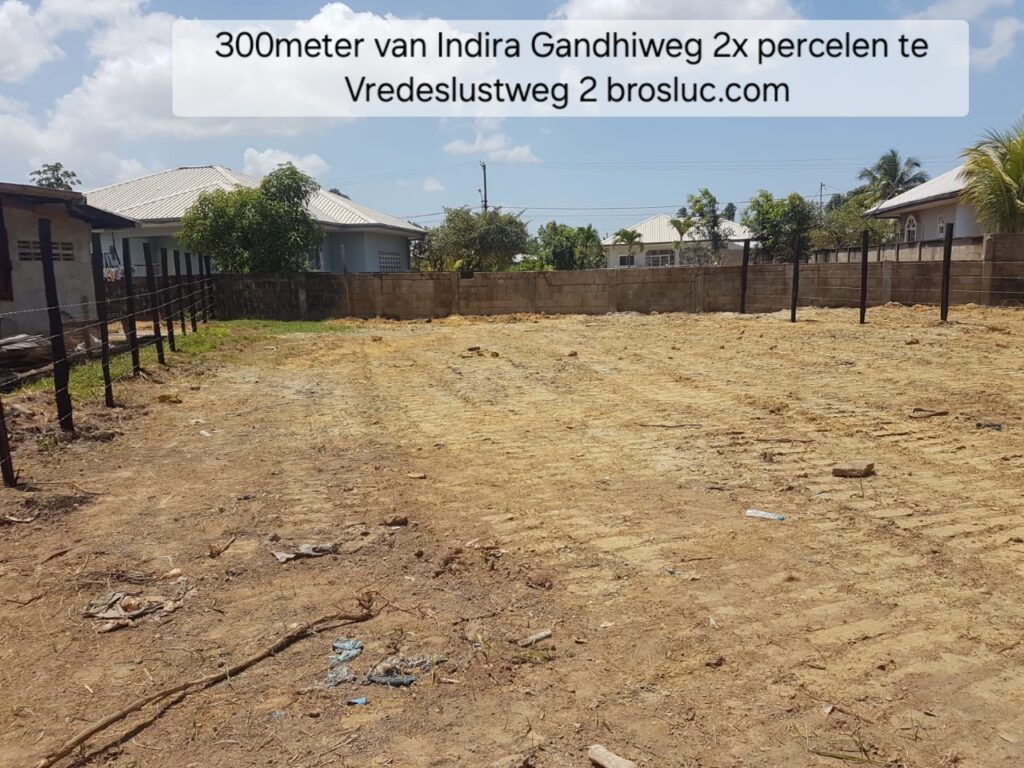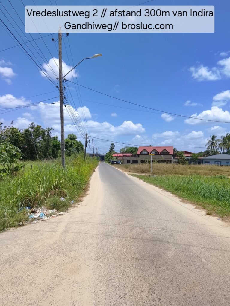 Slechts 50m vanuit de geasfalteerde Vredeslust2 weg en slechts 300meter vanuit Indira Gandhiweg. Zie winkel centra, de Zondaagse markt, Sol benzine pomp, in de omgeving. De titel is eigendom. Frontbreedte is 16mx L30.5m. De kavels worden ook per stuk verkocht euro36,500.-